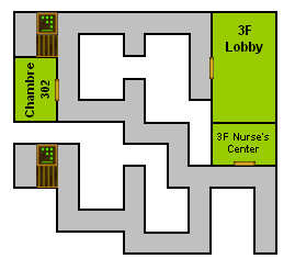 Allez dans la Nurse Center de l'étage pour trouver QQ Helmet x2 et Dis-poison x1 dans les cartons. Vous pouvez examiner la chambre 302 plus loin mais elle est vide. Prenez les escaliers à côté pour redescendre d'un étage, il n'y a rien dans le lobby à l'est.
